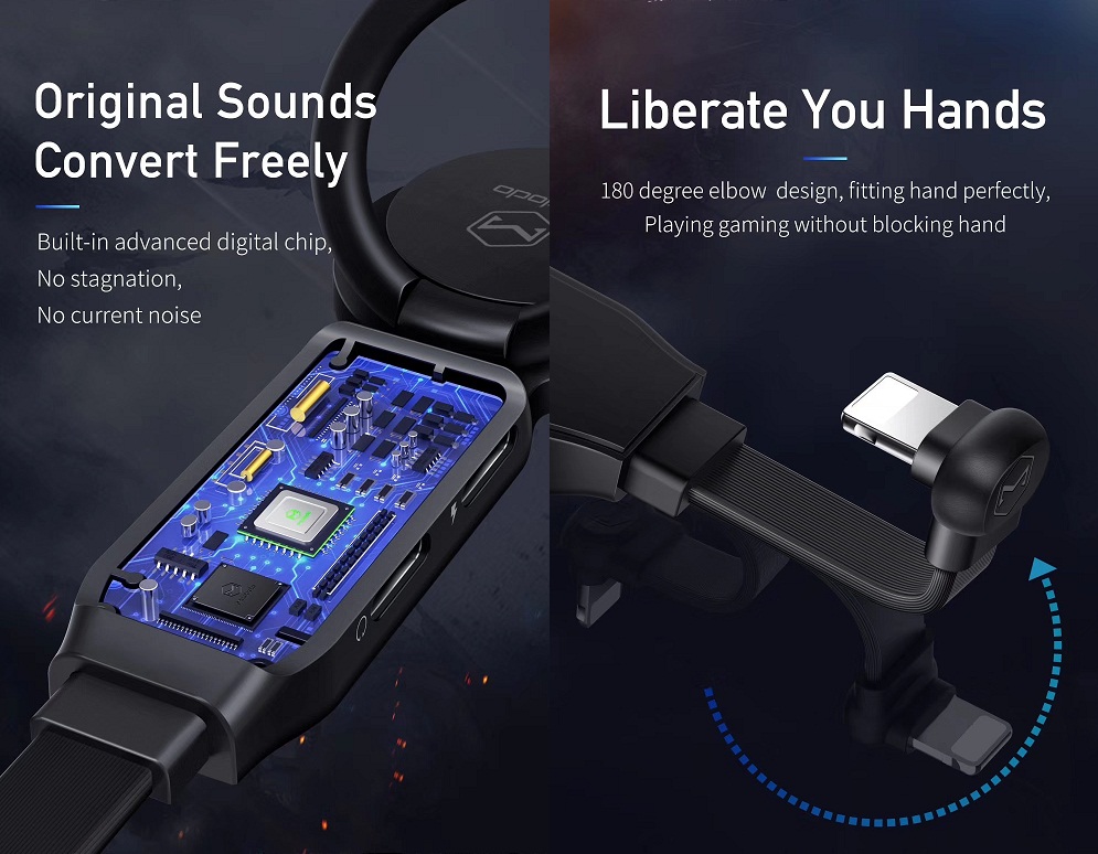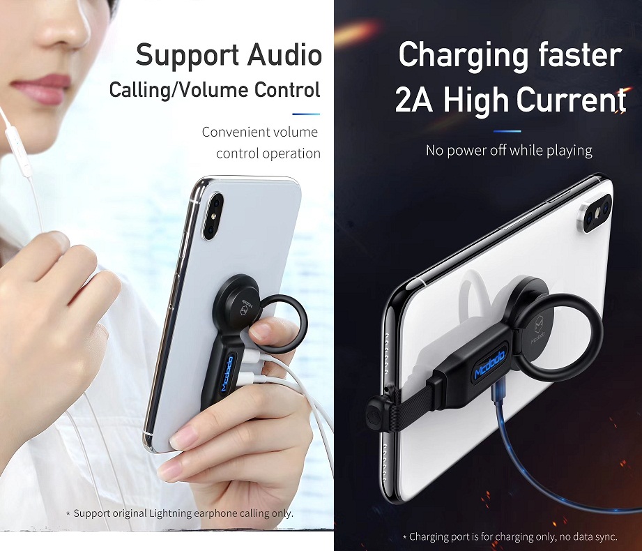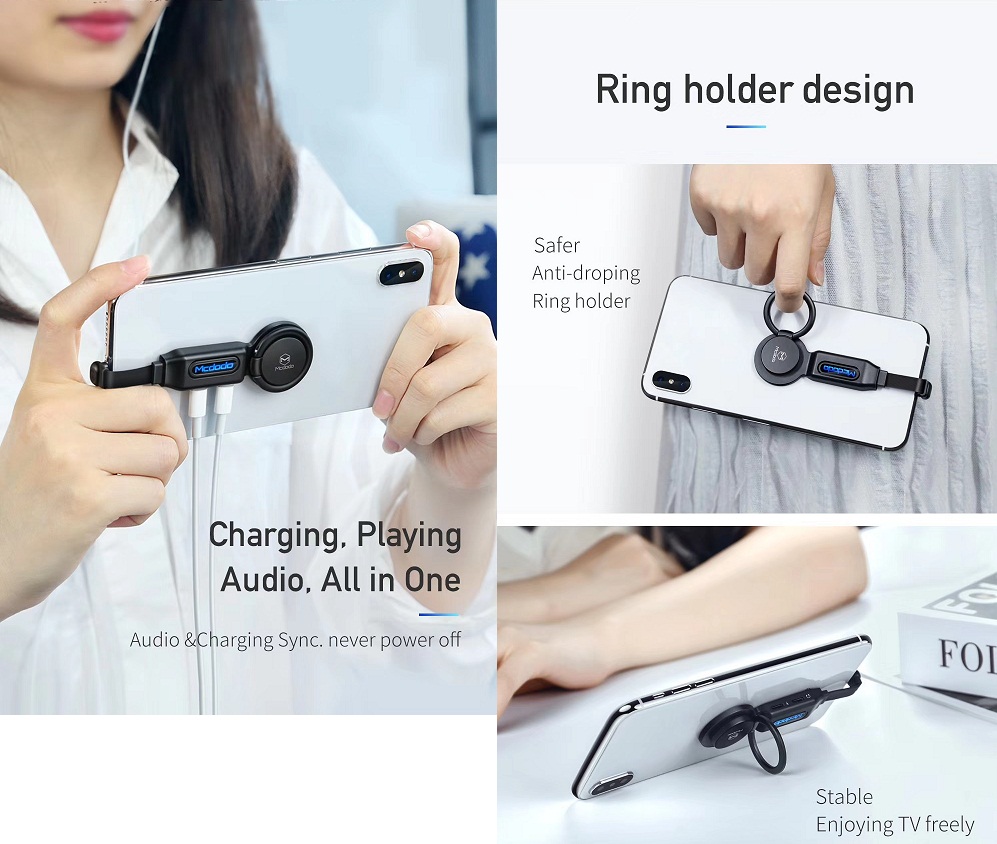 Mcdodo 4-in-1 Audio Adapter Ring Bracket Dual Lightning CA-6290 adalah sebuah audio adapter yang memiliki male interface lightning dan female interface lightning + lightning. Sehingga dengan menggunakan produk ini, anda tetap bisa melakukan charging walaupun sambil menggunakan headset di iPhone yang hanya memiliki 1 port lightning untuk charging port dan audio portnya.