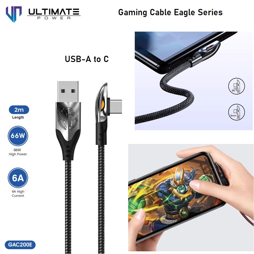 Ultimate Data Cable Gaming USB-A to Type-C 2M 66W Fast Charging ini didesign dengan bentuk yang unik yaitu eagle series yang memiliki lampu LED yang menyala saat digunakan. Mewah dan Premium.