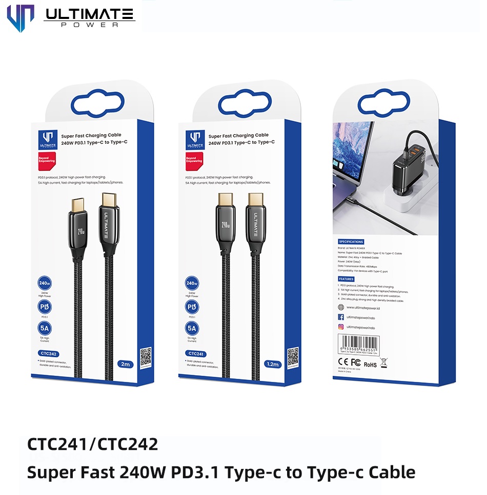 Ultimate PD 100W Type-C to Type-C Cable ini memiliki 2 ukuran panjang yang dapat anda pilih sesuai dengan kebutuhan anda, ketiganya mampu 240W dan 480Mbps.