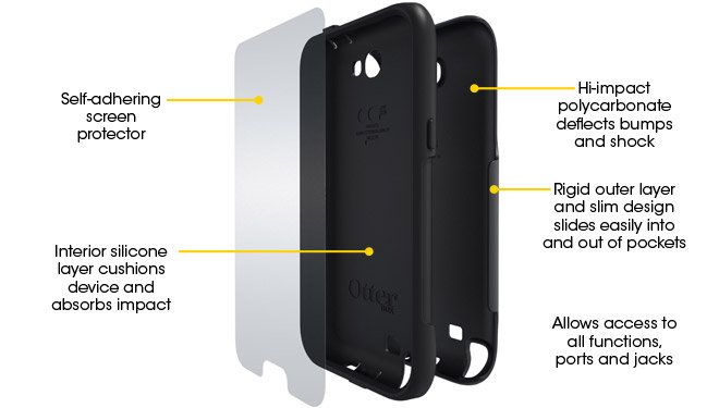 Features: Multiple layers of protection include a polycarbonate inner layer, silicone outer layer and belt holster Port covers prevent dust and debris from entering charging port, headphone jack and volume controls Complete access to all features of the device, including microphone, speaker, camera and all buttons. Environmental Protection: The Defender Series Galaxy Note 2 case provide added protection against drops, bumps and shocks but is NOT protective against water.