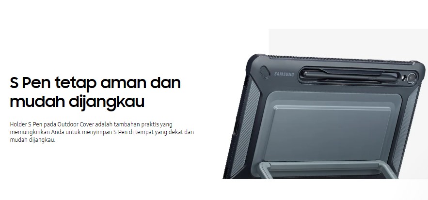 Holder S Pen pada Outdoor Cover adalah tambahan praktis yang memungkinkan Anda untuk menyimpan S Pen di tempat yang dekat dan mudah dijangkau.