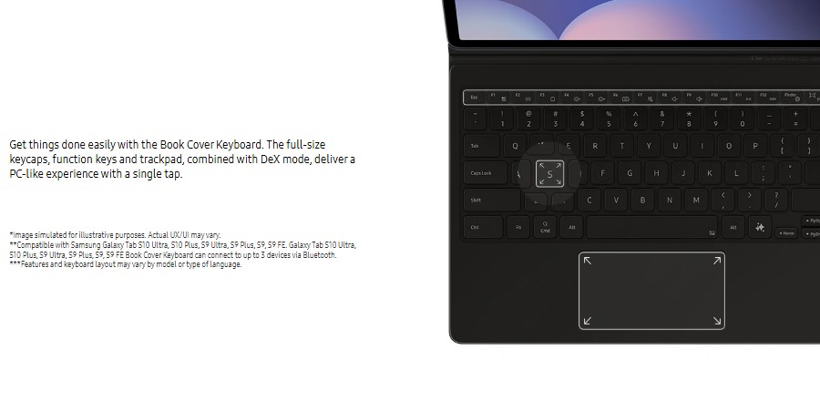 Get things done easily with the Book Cover Keyboard. The full-size keycaps, function keys and trackpad, combined with DeX mode, deliver a PC-like experience with a single tap.