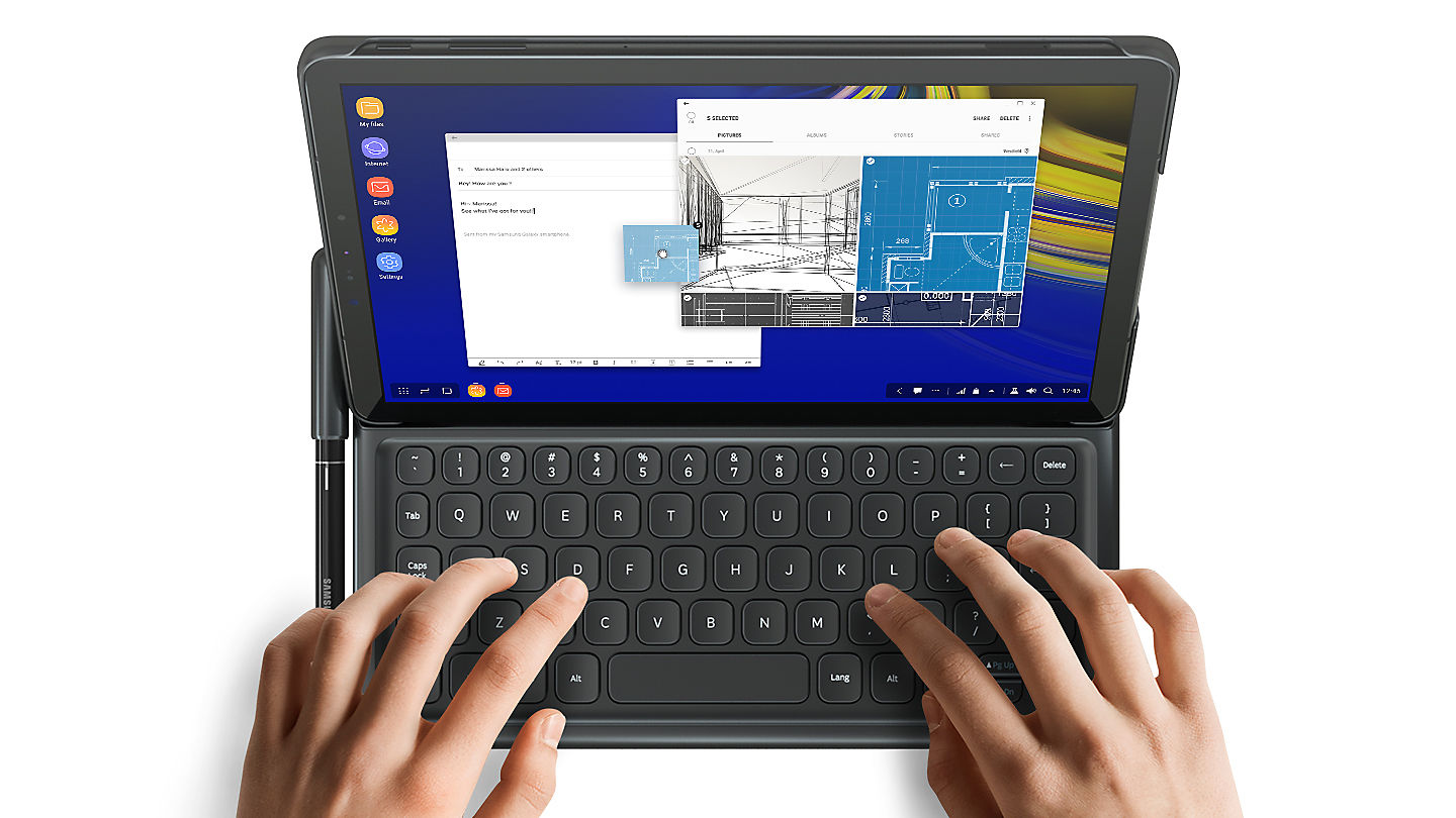 Productivity doesn’t have to wait when you have a Book Cover Keyboard. The case communicates with the Galaxy Tab S4 when in use and Samsung DeX launches when you place it on the built-in POGO pin connector on the keyboard. Connect it to a mouse and monitor for an even more desktop-like experience.