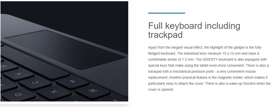 Apart from the elegant visual effect, the highlight of the gadget is the fully-fledged keyboard. The individual keys measure 15 x 15 mm and have a comfortable stroke of 1.3 mm. The QWERTY keyboard is also equipped with special keys that make using the tablet even more convenient. There is also a trackpad with a mechanical pressure point - a very convenient mouse replacement. Another practical feature is the magnetic holder, which makes it particularly easy to attach the cover. There is also a wake-up function when the cover is opened.