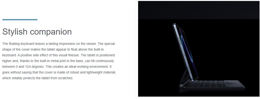 The floating keyboard leaves a lasting impression on the viewer. The special shape of the cover makes the tablet appear to float above the built-in keyboard. A positive side effect of this visual finesse: The tablet is positioned higher and, thanks to the built-in metal joint in the base, can tilt continuously between 0 and 124 degrees. This creates an ideal working environment. It goes without saying that the cover is made of robust and lightweight material, which reliably protects the tablet from scratches.
